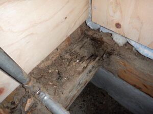 また、洗面所の壁を剥がすと柱や土台、梁、筋交などが激しく食害されていて建物の耐震性が全くない状態と言っていいほどの状態でした。