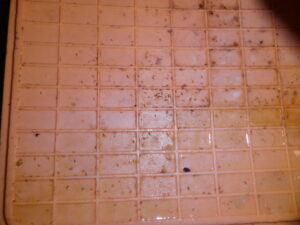 発生源を特定するために調査をすると、シンク横にスチロールボックスを裏返しにして棚代わりにしているところがあり、棚の上に載っているものを移動させてもらうとボックスの溝に無数のチョウバエの幼虫と成虫が発生してるのを発見しました。