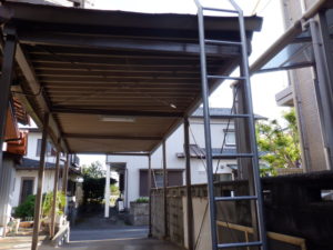 本日はカーポートの鉄骨部分のケレン、錆止め、ウレタン仕上の段取りとなりました。