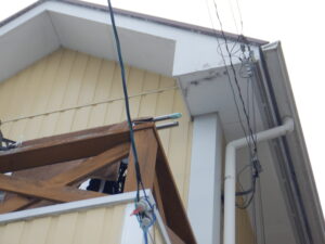 軒天の雨漏りの原因は調査してみないとハッキリとは言えませんが、急こう配の屋根は近年の横殴りの激しい雨で防水が取れていない軒裏に雨が当たってしまい雨水が侵入してしまうケースがあります。