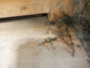 築40年以上経過していることもあり、基礎は布基礎工法で床下は土が剝き出しとなっているので床下内はジメっとしていて湿気の強さを感じ、土台には白色腐朽菌が発生している様子も確認されて、シロアリが発生しても何ら不思議ではない環境でした。
