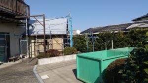 本日の工程は足場工事、産廃コンテナの搬入でした。