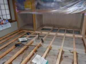 先月末に白アリ駆除をさせて頂いたお客様。和室の畳・荒床及び押入床にまで白アリ被害があった為、本日改修工事を行いました。