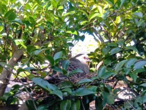 見ると高さが180㎝ほどある木の枝に鳩が巣作りをして卵を温めているようでした。