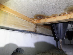 外観や居室内に大きな問題はありませんでしたが、床下の調査を行うと浴室の入口下の土台から水が漏れの跡が確認できました。