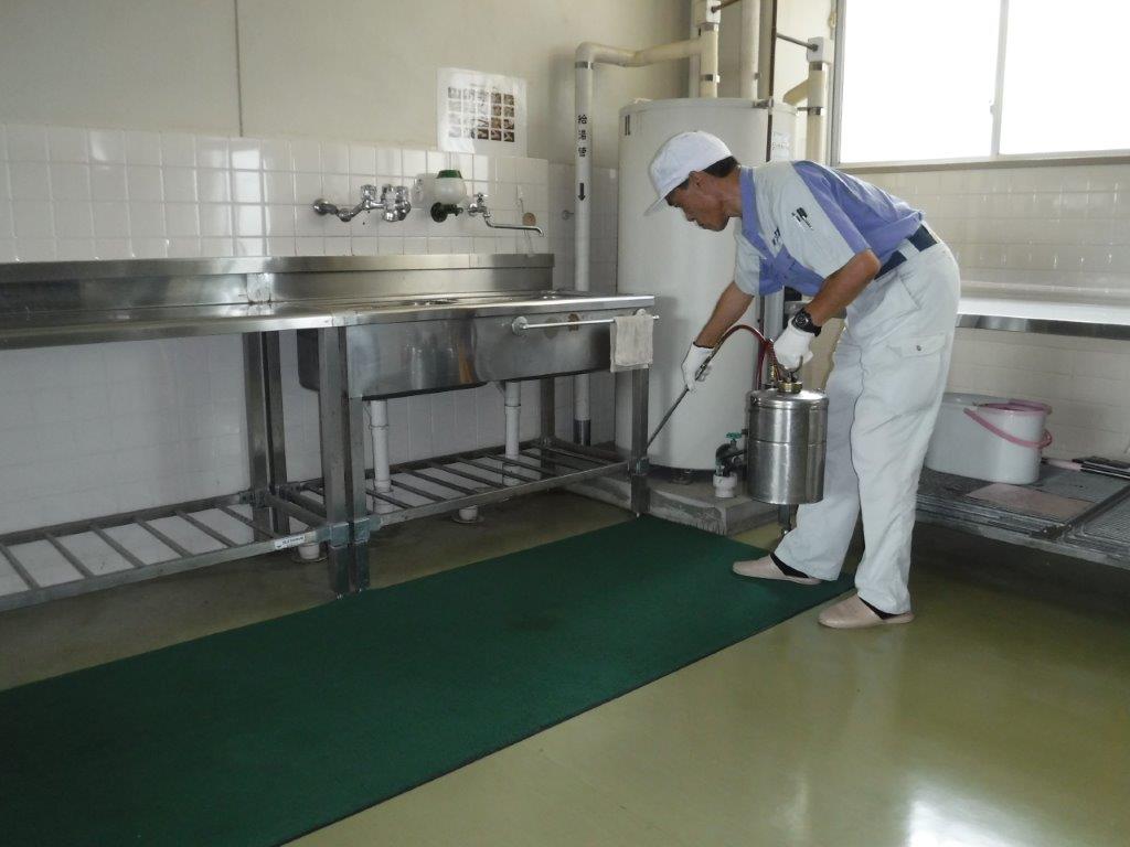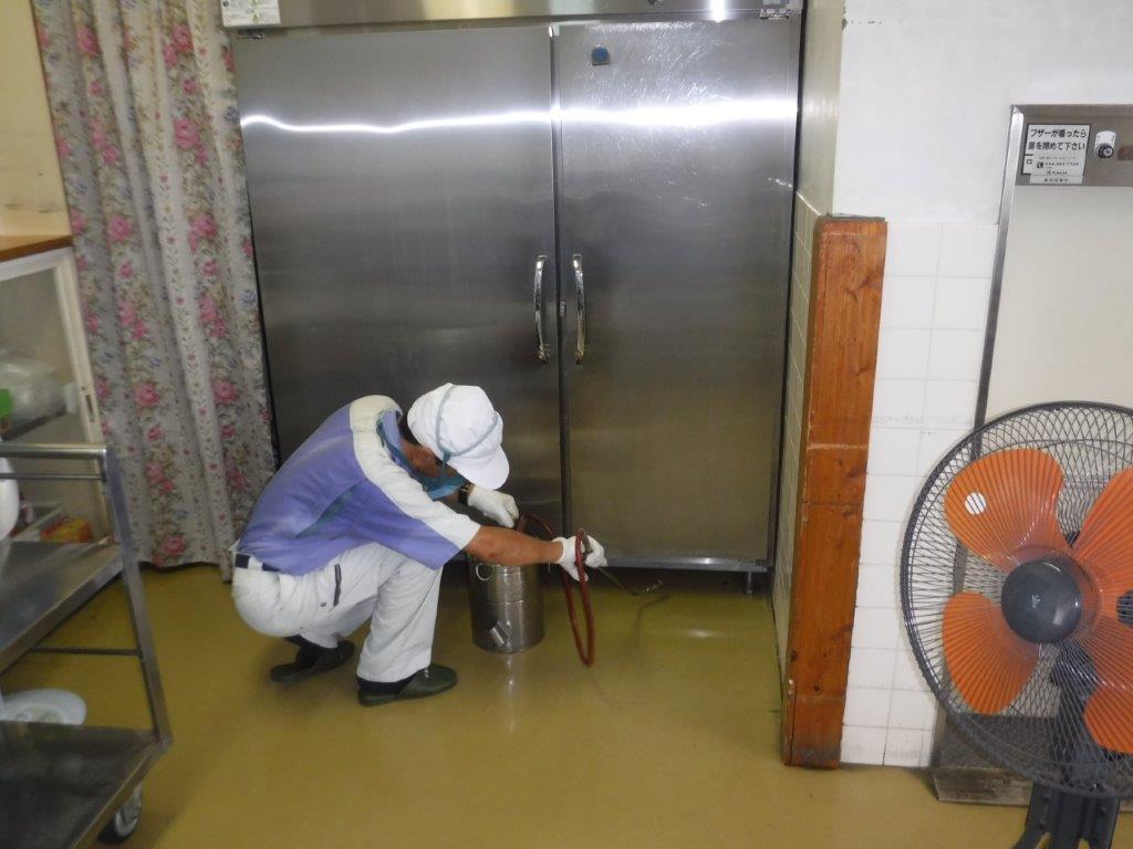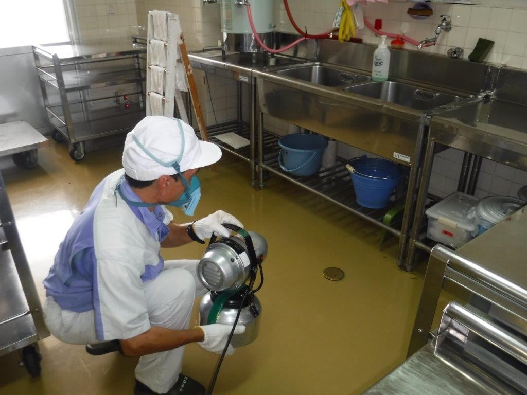 電動機器で水溶性の薬剤を超微粒子にして空間への噴霧を行います。害虫の種類に合わせて使用薬剤を選定します。